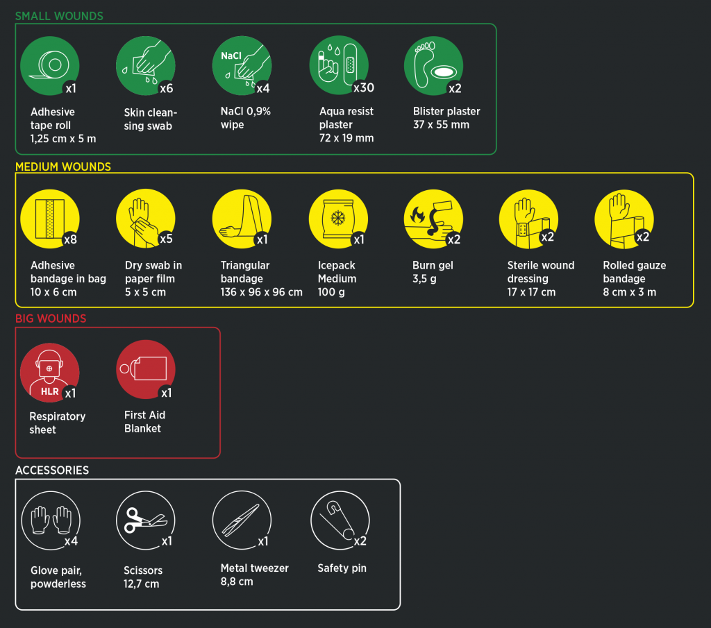 En genomtänkt och robust väska som täcker allt från småsår och brännskador till akuta situationer där andning eller cirkulation kan påverkas. Perfekt i hemmet, bilen och på fritiden. Tydlig färgkodning ger överblick på sekunder så du kan agera direkt.