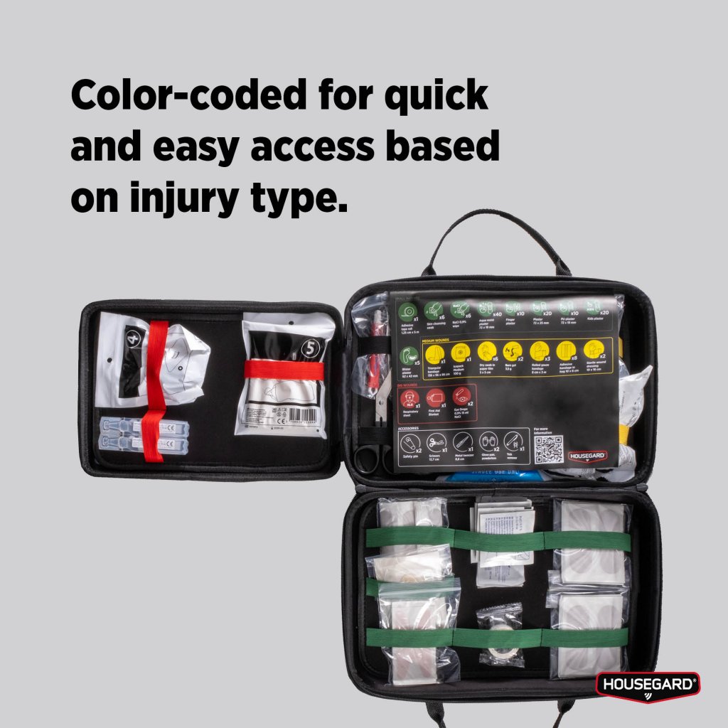 Housegard Premium ger dig allt du behöver för att snabbt hantera småsår, brännskador, ögonirritation och större skador – hemma, på jobbet eller på resan. Tydlig färgkodning ger överblick på sekunder så du kan agera direkt.