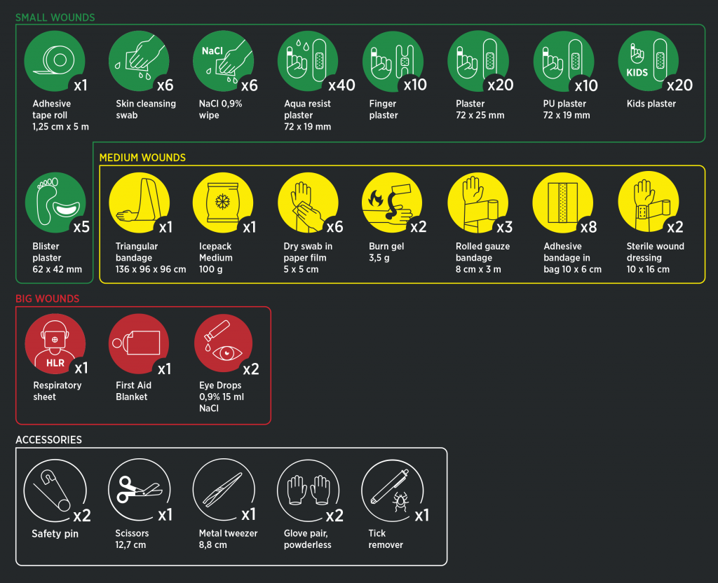 • 152 delar – komplett grundutrustning + special för ögon & brännskador